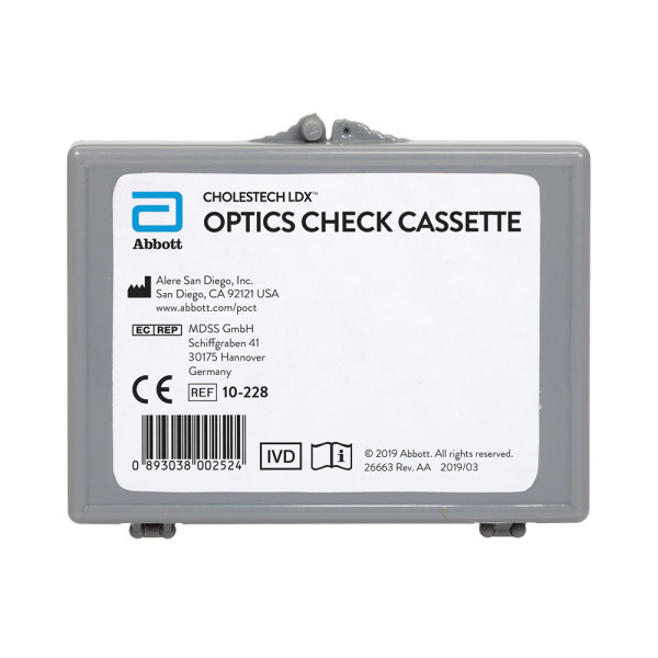 The Optics Check Cassette performs a check on the optical system of the LDX analyzer based on known reflectance values encoded in the cassette. The manufacturer recommends that the optics check should be run once a day before patient samples are tested as well as after the LDX analyzer has been moved or serviced. The Optics Check Cassette is reusable until its expiration date. When not in use, it should be stored at room temperature in the case provided.