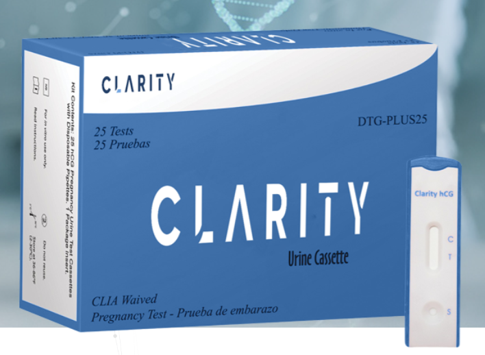 The Clarity Pregnancy One Step Rapid Test (Cassette) is an in vitro diagnostic visual qualitative immunochromatographic assay designed for the rapid determination of human chorionic gonadotropin (hCG) in urine to aid in the detection of pregnancy. For professional use and OTC self test use.