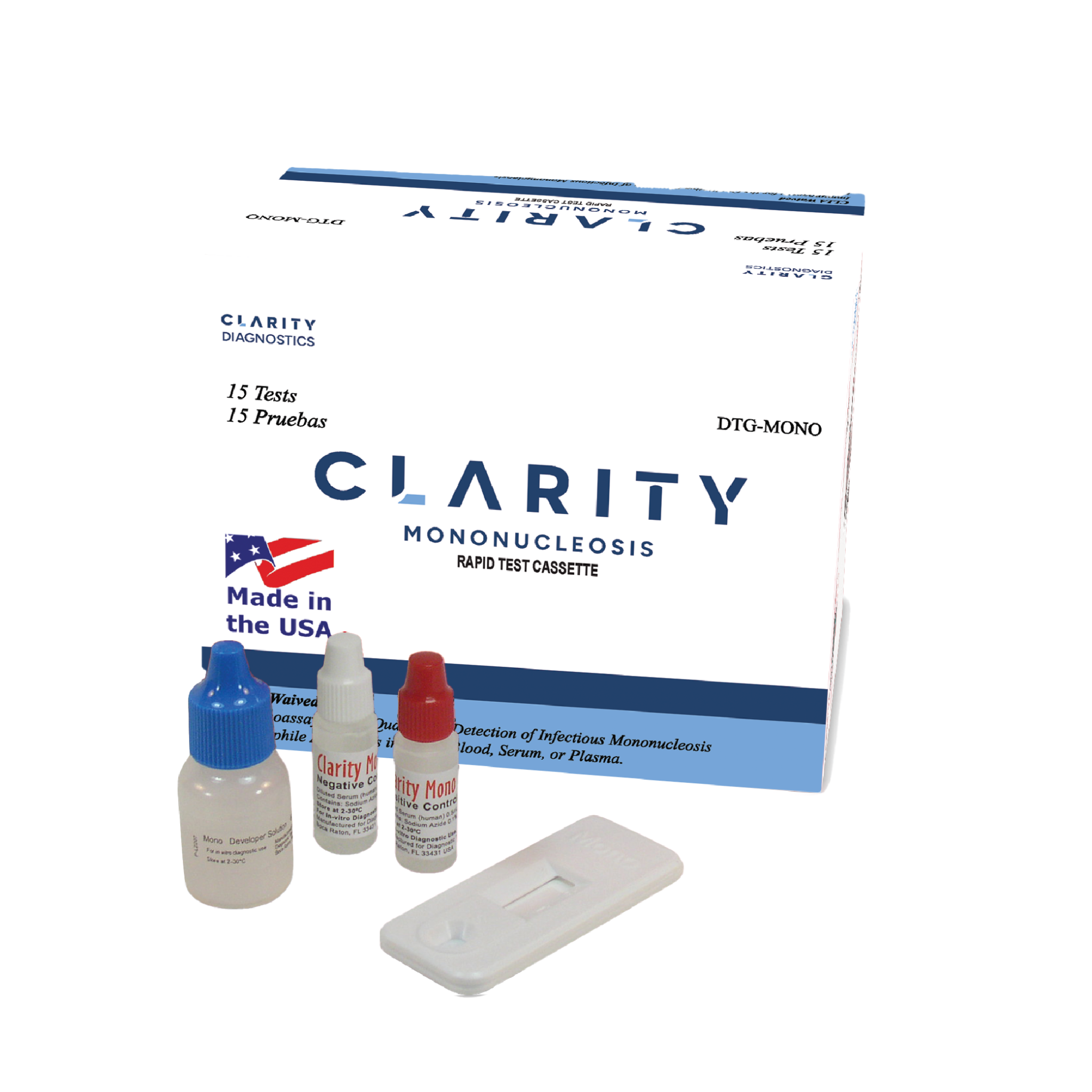 Contents: (15) Test Cassettes, 1-Developer Solution, 15-Sample Transfer Tubes, 1-Positive Control, 1-Negative Control, Package Insert, and Procedure Card