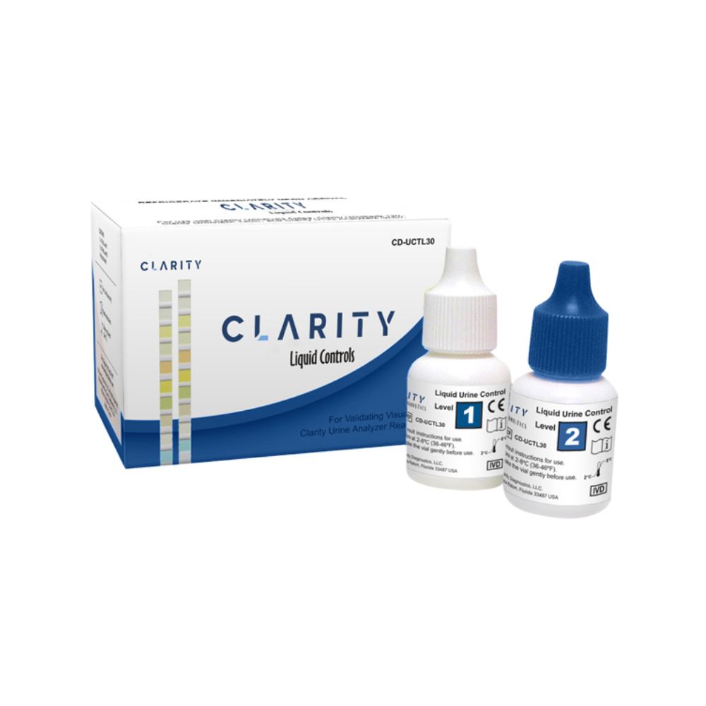 The Clarity Urocheck Liquid Controls are for use with the Clarity Urocheck brand urine analyzers and reagent strips. They ship in 3 sets of 10 mL easy-to-use dropper bottles with color coded caps.