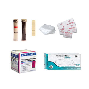 Contents: Capillary Tubes (40 uL), Capillary Plungers, Lancets, Alcohol Prep Pads, Gauze Pads, Band-Aids, Nitrile Gloves